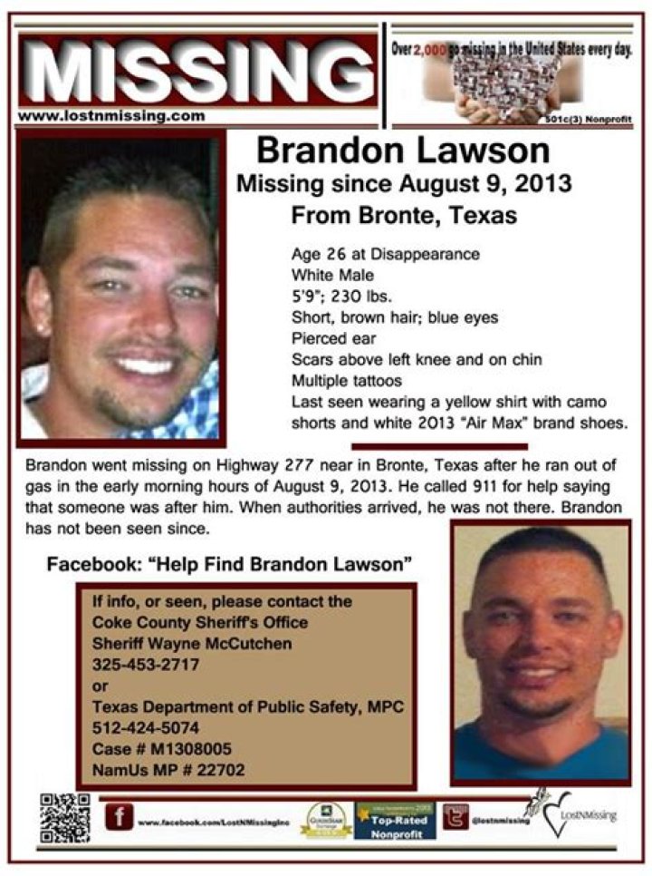 A few miles south of Bronte, Texas, on a lonely stretch of Highway 277, American Brandon Mason Lawson ran out of gas and vanished in the early hours of August 9, 2013.