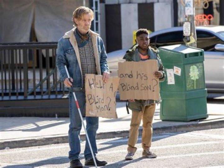 Frank and Liam are in the middle of the street, pretending to be blind, begging for money. One man pulls them out of the street and gives them money, and when he turns around, he gets run over by an eighteen-wheeler.